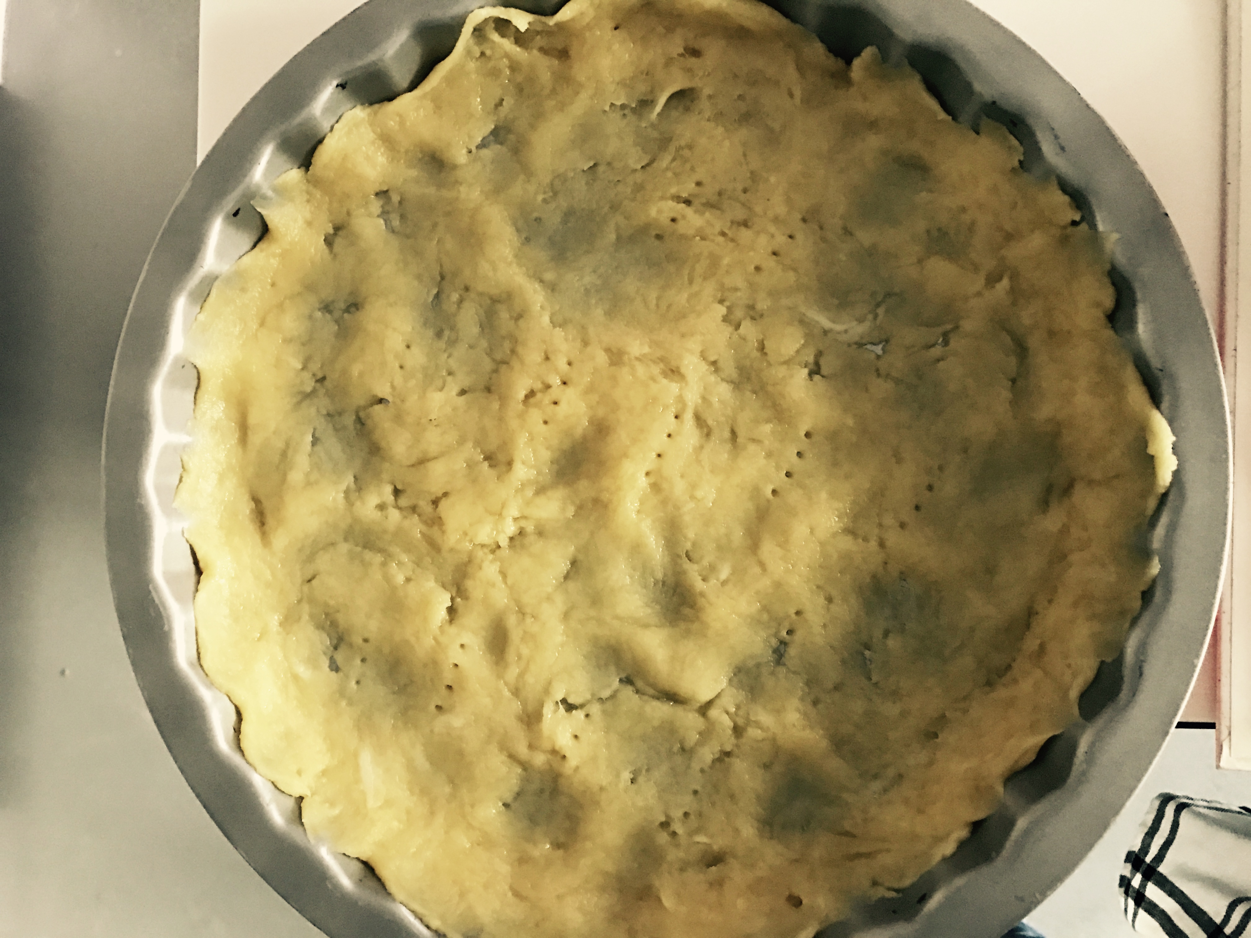 Gdy uzyskam jednolitą kulkę ciasta rozprowadzam je w formie do tarty, nakłuwam widelcem i wstawiam do piekarnika o temperaturze 200 stopni na 15 minut (dzięki temu spód będzie chrupiący).