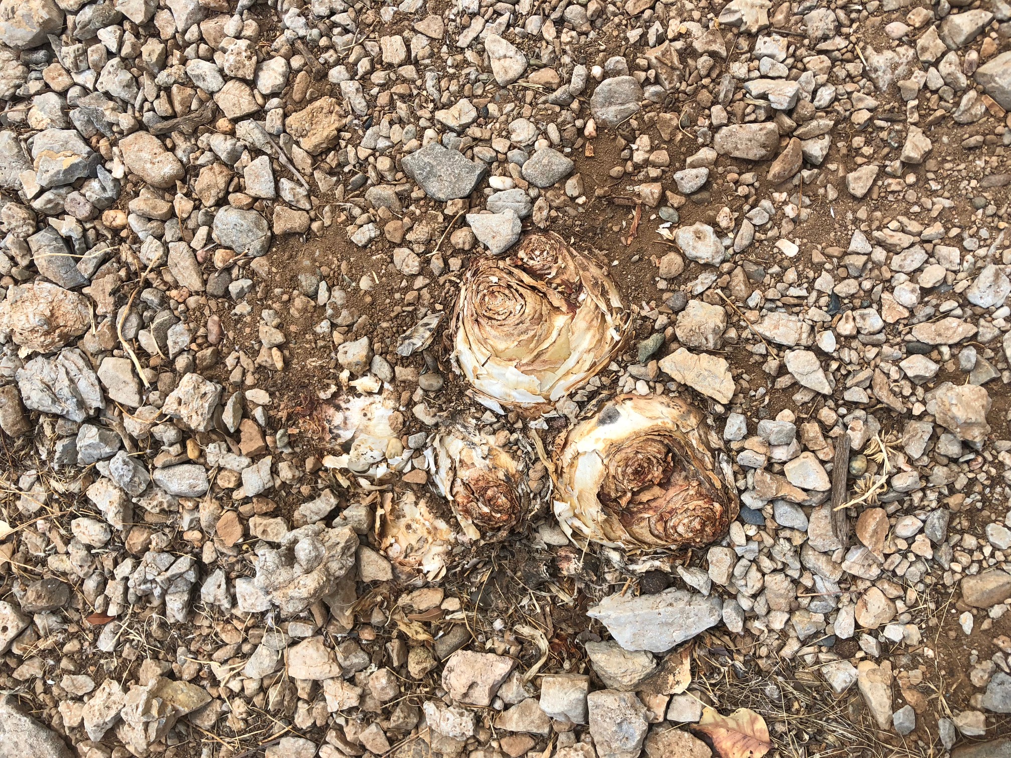 W związku z tym, że przestało padać wróciliśmy po swoje rzeczy, przejechaliśmy z powrotem autem, które zatrzymaliśmy na rozstaju dróg i z plecakiem ruszyliśmy pieszo w stronę tej trzeciej. Musieliśmy przejść pieszo przez podwórze hoteliku, kierując się znakiem drogowym. Doszliśmy do płotu z tabliczką ‚otwarte’ i zaczęliśmy wspinać się po skałkach. Cóż tam były za widoki! Coś niesamowitego. Z jednej strony spalone słońcem skały, uschnięte cebulki kwiatów, z drugiej wyrastające niespodziewanie gdzieniegdzie intensywnie zielone rośliny. Przypuszczam, że wiatr przenosi czasem od morza morską bryzę i dzięki tej odrobinie wilgoci fauna bucha soczystą zielenią, bo wie, że czasu ma niewiele.