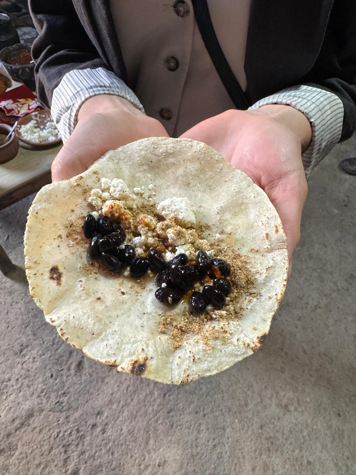 W każdej restauracji, knajpce i w przydrożnym barze są tortillę. Takie danie również poznaliśmy u kobiet z wioski… (świeżo smażone na metalowej płycie nad ogniem). Tortille, czyli te kukurydziane lub fasolowe placki są podstawą wielu dań, takich jak tacos (krojone i smażone), enchiladas (zapiekane zawijasy), quesadillas (podawane w specjalnych falowanych naczynkach) czy burritos (zawijasy z fasolą, mięsem, warzywami).